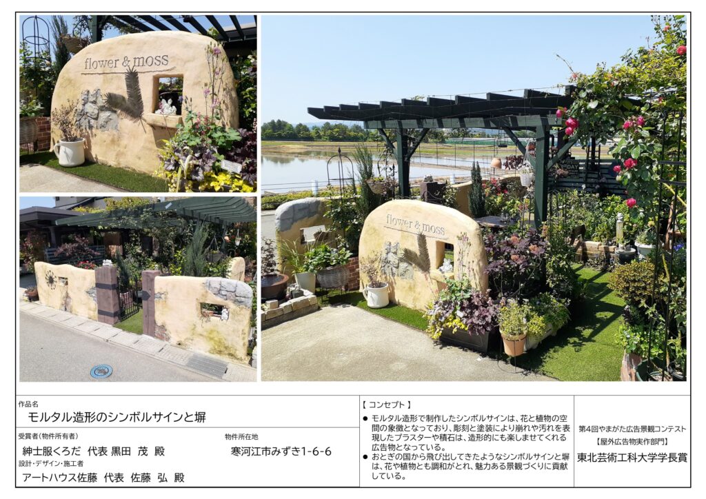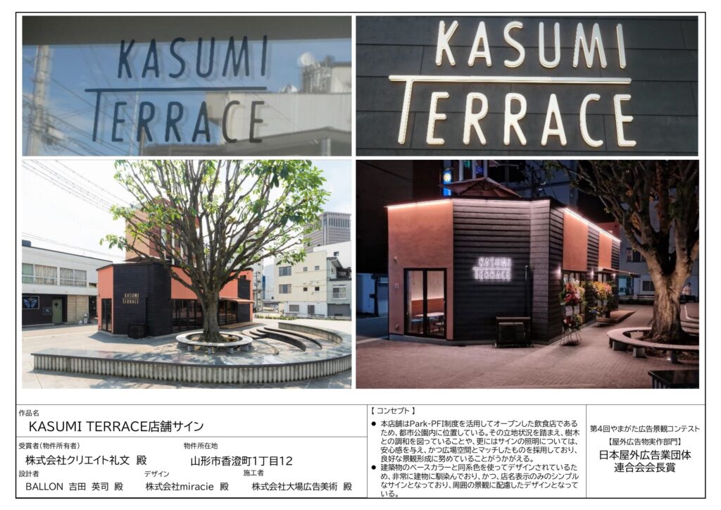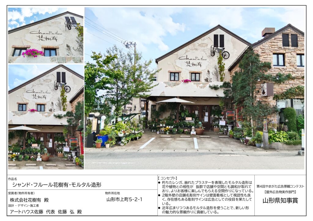 山形県内に既に設置されている看板などの屋外広告物で、魅力あるまちなみや景観を形成しているもののうち、審査員から高く評価された屋外広告物を表彰するものです。