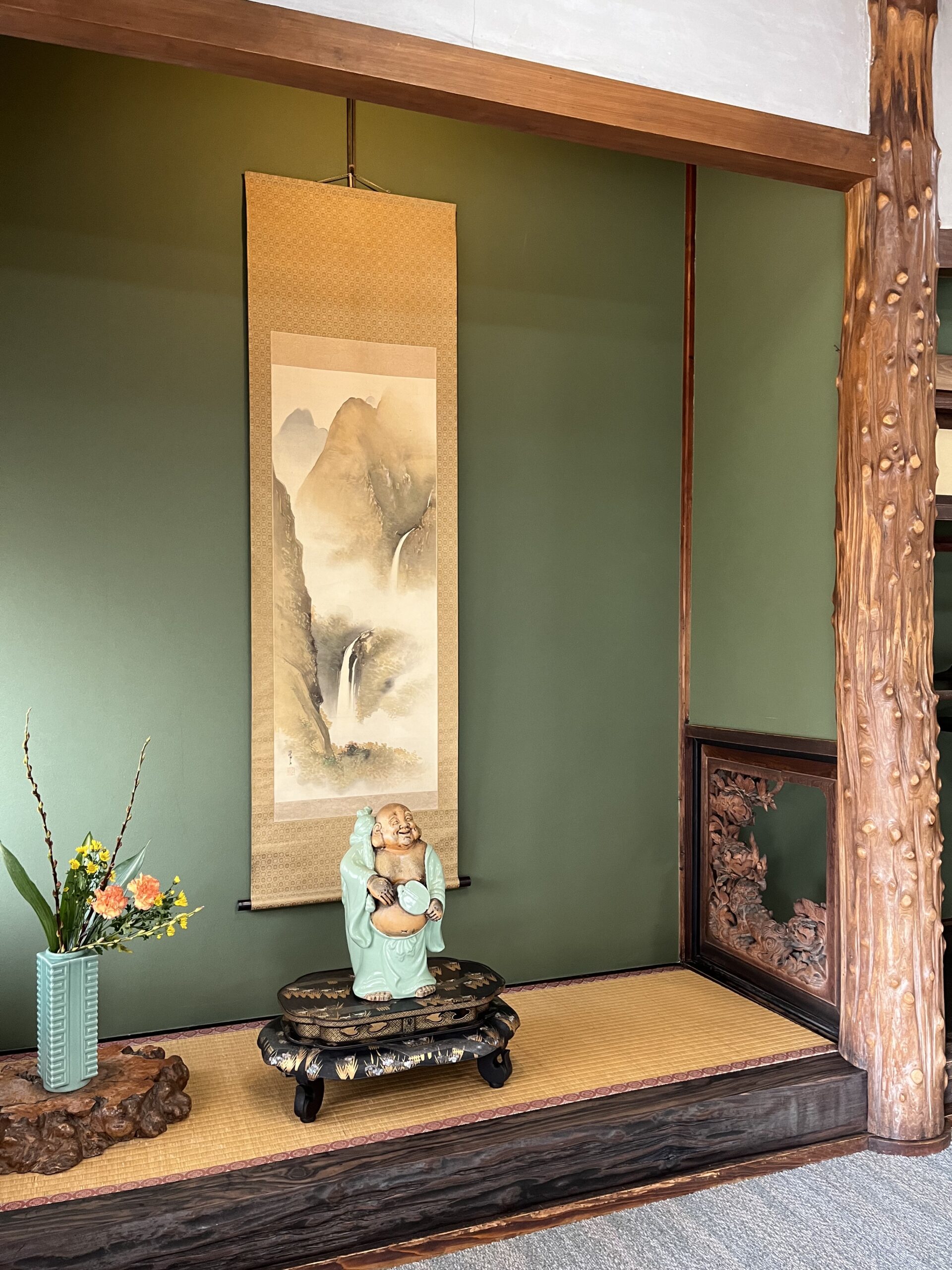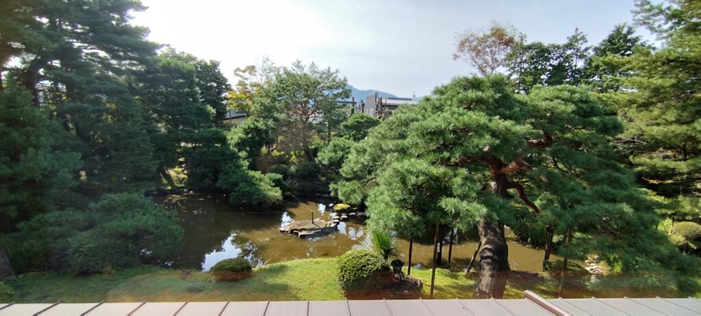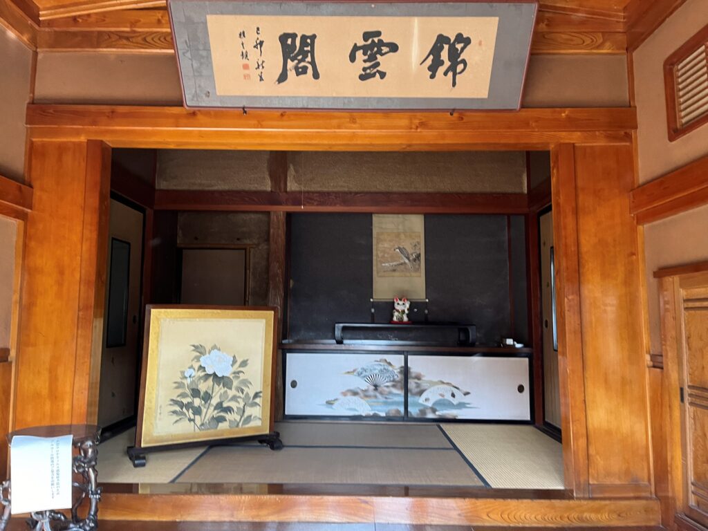 二階の客室からは庭園越しに金峯山を眺めることができました。金峯山を借景にした庭園を眺めることができるこの場所は、鶴岡を訪れる客人をおもてなしする場所として多くの宴が行われ、賑わっていたのだろうと想像することができました。