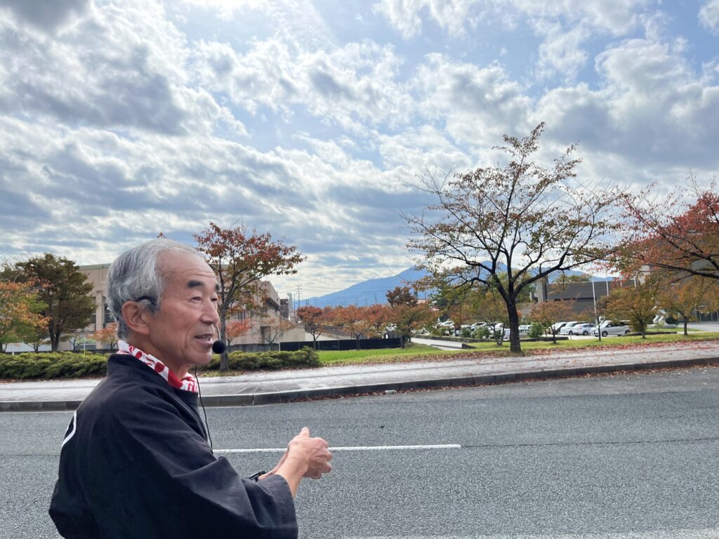 「あの木がある辺りにベンチを置いて眺めたら、金峯山の印象はどうでしょうか?」と問いかけながら、元からあるこの高低差を活かして視点場を整備していくと、金峯山が美しく見えて、市民に景観の美しさを認識させやすくなると講師は語ります。