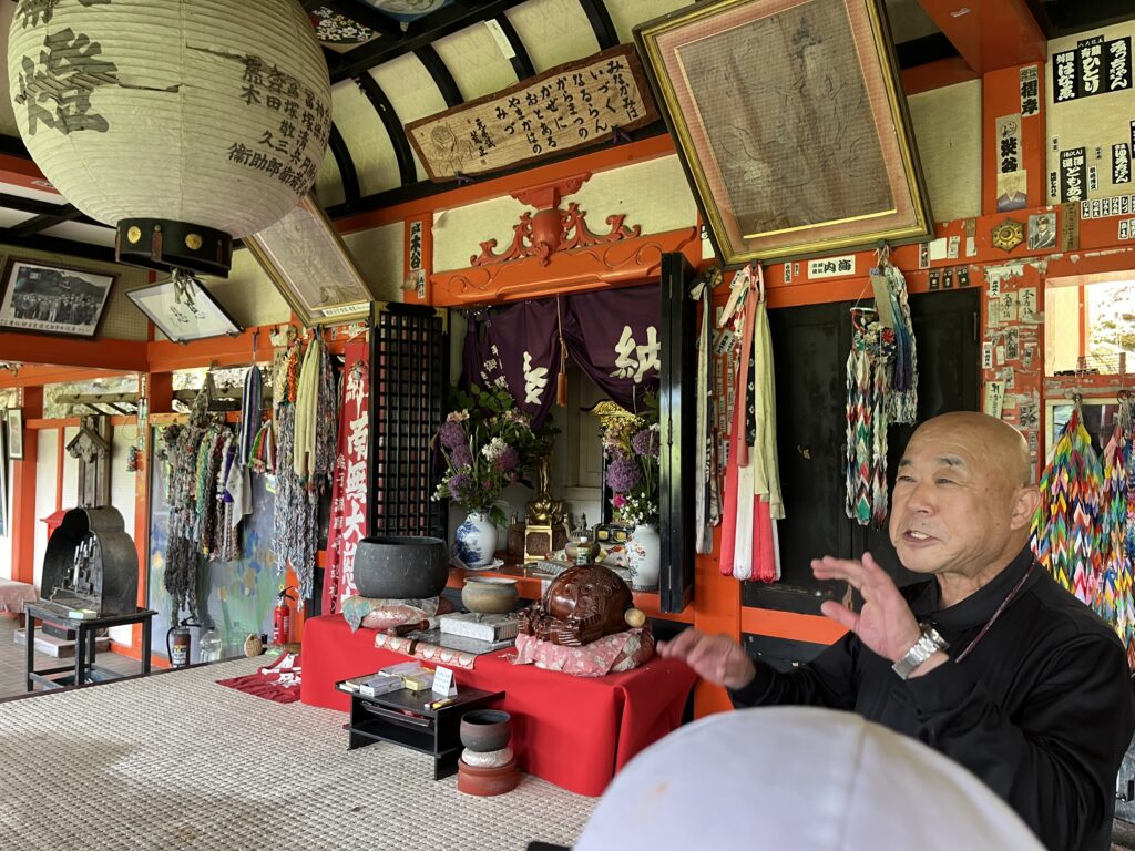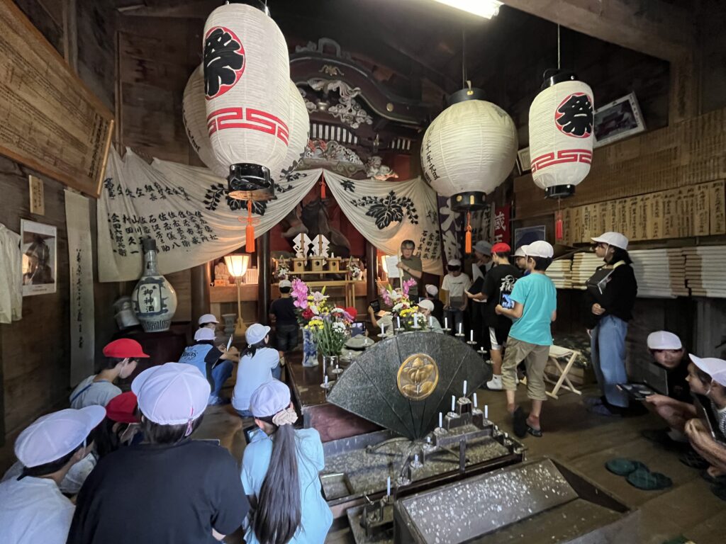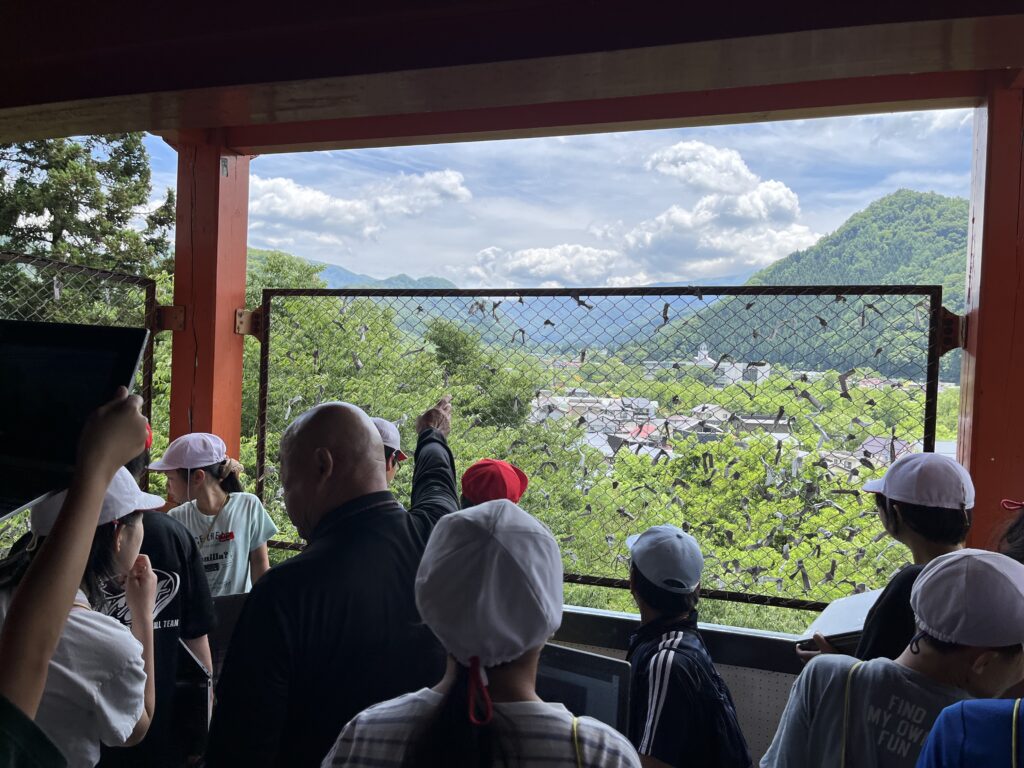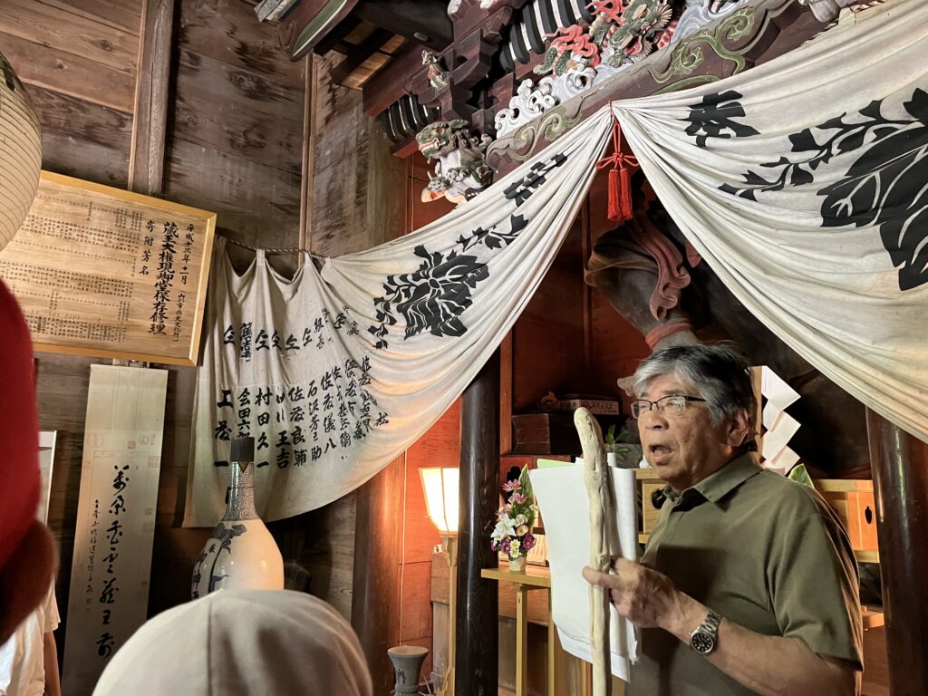 ここで、蔵王大権現のルーツと、山形の夏の風物詩「花笠祭り」の神事をこの場所で行いスタートすることをお話いただきました。子供達は「初めて知った!」とびっくりしていました。花笠まつりの踊りの練習にも一層力が入りそうです。