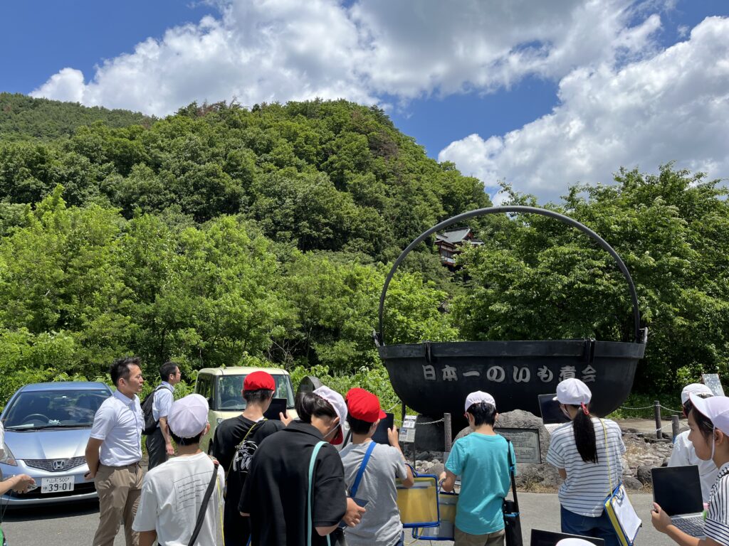 山形市まちなみデザイン課の倉田主事より芋煮会の大鍋「鍋太郎」設置のお話を聞き、観光PRに繋げる山形市の取組みを聞きました。この場所から鍋の柄の中に唐松観音を仰ぎ見る写真が撮れます。子供達の撮影にも力が入ります。まさに、東沢地区にしかない景観を意識することができます。