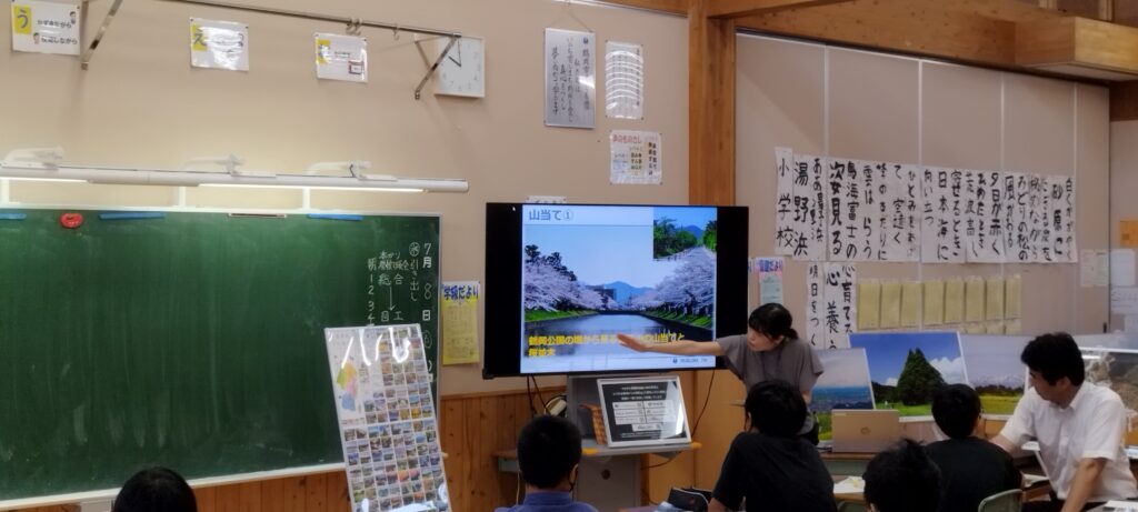 鶴岡市の湯野浜地区は海水浴場に面しており、海に囲まれ、美しい夕日、温泉街がある県内でも観光が盛んな地域です。ここで育った子供達にとっては日常の風景ですが、「景観」という観点で、地域をみつめ、地元の魅力を見出してほしいという先生の思いがあり、景観出前授業を取り入れてくださいました。景観とは何かの説明の後、県内の景観、県の景観の取り組みを紹介していきました。