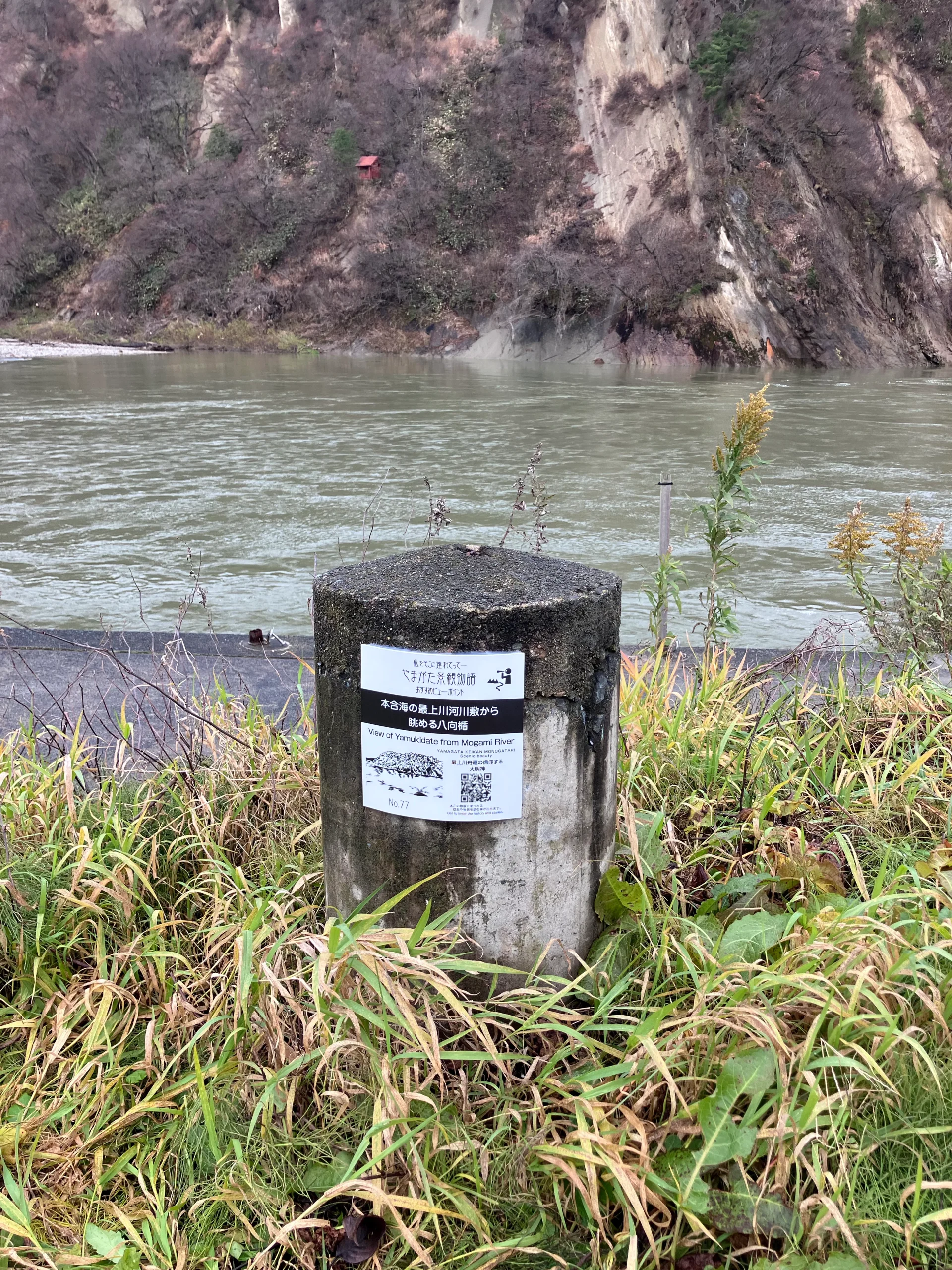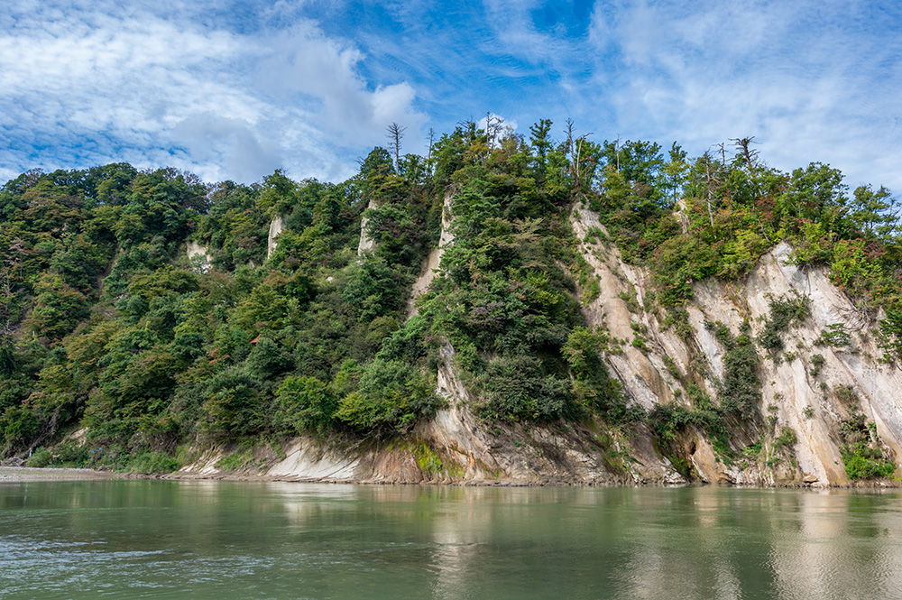 八向楯は最上川岸壁に築かれた中世の城(楯)です。義経伝説も残るこの場所は、最上川の雄大な流れに白い絶壁、青い空と朱色の鳥居が映える絶景を眺めることができます。